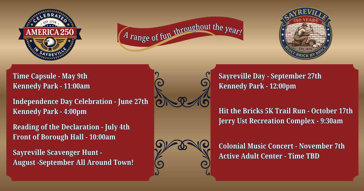 Please CLICK HERE to direct you to the dedicated website for all events related to the America 250 & Sayreville 150 celebrations.